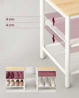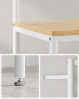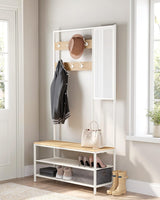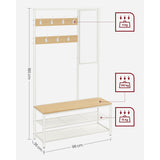 Kleur: eikenkleurig wit. Materiaal: houten spaanplaat, staal. Afmetingen: 35 x 98 x 180 cm (d x b x h). Gewicht: 15,9 kg. Maximale Statische belastbaarheid per haak: 5 kg. Maximale Statische belastbaarheid per roosterplank: 15 kg. Maximale Statische belastbaarheid van de zitting: 100 kg