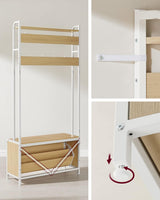 Kleur: eiken, wit. Materiaal: spaanplaat, staal. Afmetingen: 30 x 85 x 180 cm (l x b x h). Productgewicht: 20,1 kg. Maximale Statisch draagvermogen van elke haak: 5 kgMax. Statische belasting van de bank: 100 kg. Maximale Statisch draagvermogen van het bovenste rek: 10 kg
