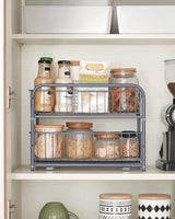 Houd uw keuken gelukkig: te midden van de chaos kunt u het moeilijk vinden om maaltijden te bereiden. Deze organiser met 2 legplanken zal u helpen! Dankzij zijn veelzijdigheid kunt u hem zo aanpassen dat hij onder uw aanrecht past om erboven ruimte te creëren. Als de ruimte niet volstaat, kunt u het op het aanrecht laten staan om uw specerijen goed geordend en binnen handbereik te houden. Geniaal, is het niet?