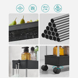 - Altijd klaar voor gebruik: laat je keukenkast met rust! Je hoeft hem niet steeds open en dicht te doen om kruiden eruit te halen tijdens het koken. Dit open keukenrek komt je te hulp. Dankzij de 4 universele wielen met robuuste metalen wielas staat hij binnen een mum van tijd naast je