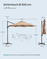 • [Grote schaduw] Draai gewoon aan de slinger om deze Ø 300 cm parasol met verlichting te openen. Dit geeft u een privéoase die comfortabel plaats biedt aan 6-8 personen - perfect voor onvergetelijke bijeenkomsten in de buitenlucht