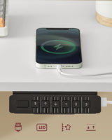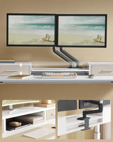 - [Justering, opbevaring, opladning] Mellemskærmpladen kan justeres i højden. På begge sider er der 2 skuffer til små genstande. Der er også perforerede paneler til at skjule kabler, 2 stikkontakter og 2 USB -porte til opladning